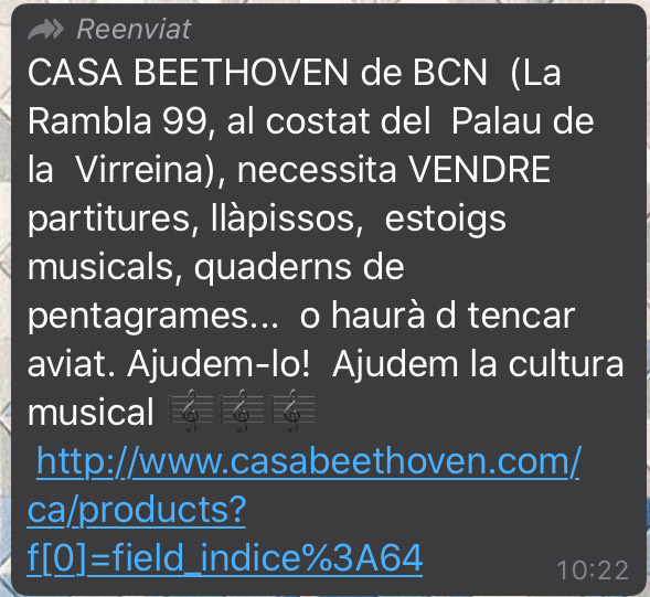 A finales de mayo de este año, cuando la mayor parte de Cataluña seguía confinada, aparecieron unos mensajes de Whatsapp que alertaban que la histórica Casa Beethoven necesitaba vender urgentemente sus productos para evitar cerrar. El mensaje corrió como la pólvora entre la población de Barcelona amante de la música que veía peligrar toda una institución de la ciudad.