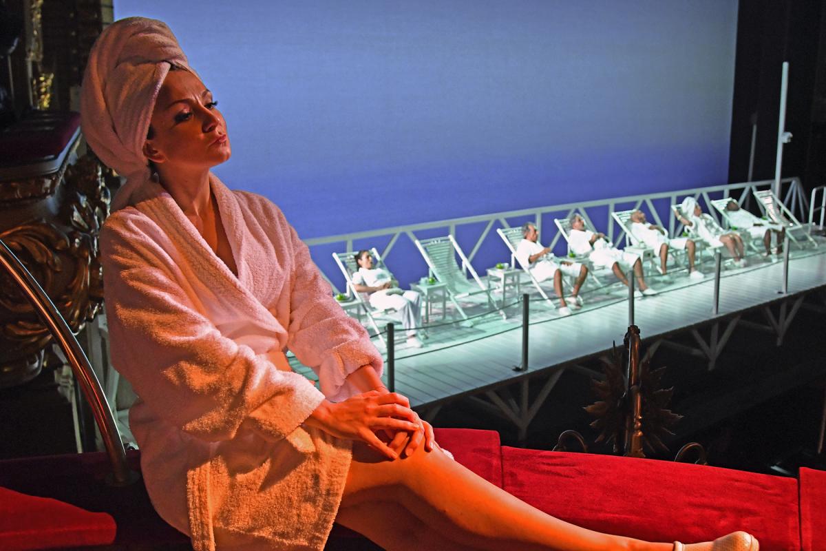 El montaje: La obra recrea una especie de balneario (en términos más modernos, una “beauty farm”), con una decoración mínima. El verdadero protagonismo recae en los personajes, que aparecen en la escena en albornoz y luego, durante la obra, delante del público, se van vistiendo de gala. Esta simplicidad parece responder al espíritu original del montaje, una creación del director de escena de Emilio Sagi a partir de la petición del Festival Rossini de Pesaro de realizar un montaje de Il viaggio a Reims para jóvenes. Aun así, el propio Sagi destaca que la producción es apta para todas las edades y que no ha modificado ningún elemento por el hecho de que el encargo inicial fuera el de una ópera juvenil. Por cierto, el montaje tuvo tanto éxito en Pesaro que se ha venido representando cada edición desde su estreno, hace ya 17 años.