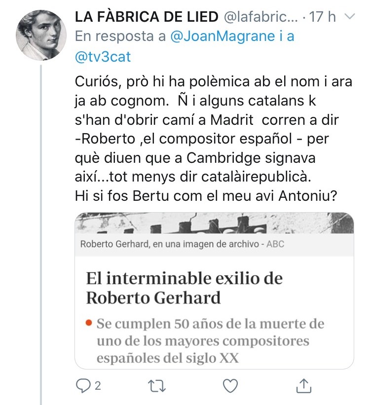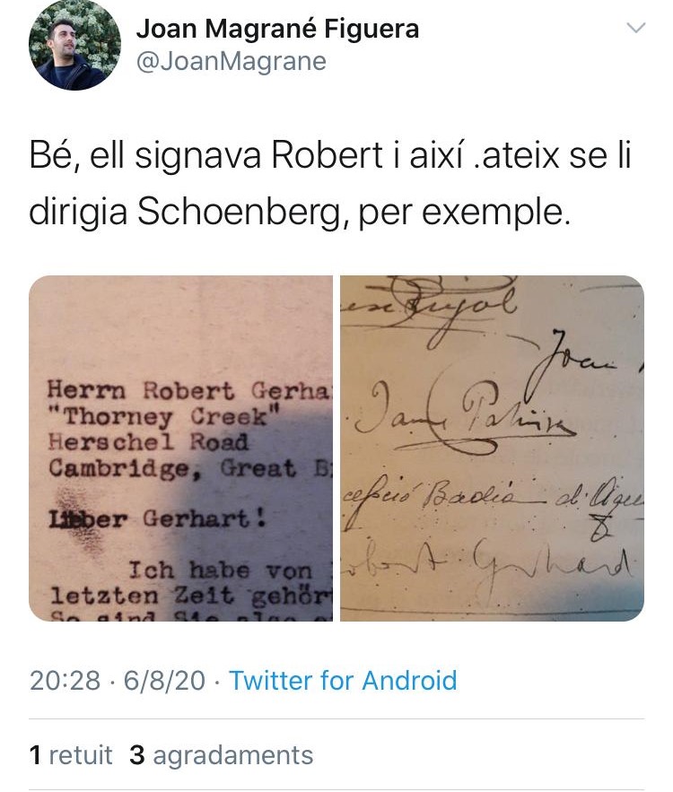 Magrané, con su gran actividad como tuitero, promete ser uno de los personajes recurrentes en esta sección. A pesar de la difusión entre los melómanos de la obra de Robert Gerhard (Valls, 1896- Cambridge 1970), el público general suele desconocer la figura de este compositor, a diferencia de otros como Albéniz o Pau Casals. De hecho, la pronunciación de su primer apellido no es excesivamente complicada si la comparamos con la de su segundo: Ottenwaelder.