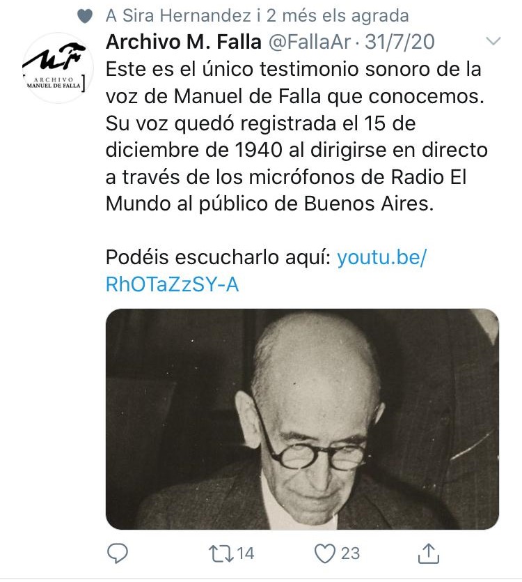 Para finalizar este recorrido entre músicos del territorio, es destacable la publicación de finales de este pasado mes de julio que compartió el fondo del Archivo Manuel de Falla en el que se difundía la única grabación que se ha conservado del compositor andaluz. Una voz que, a pesar de tratarse de un hallazgo extraordinaria, quedará en segundo plano por muchos años gracias a la vigencia y el éxito de la voz de las melodías de un Falla que sigue llenando salas de conciertos de todo el mundo.
