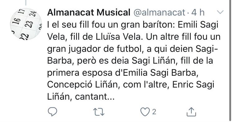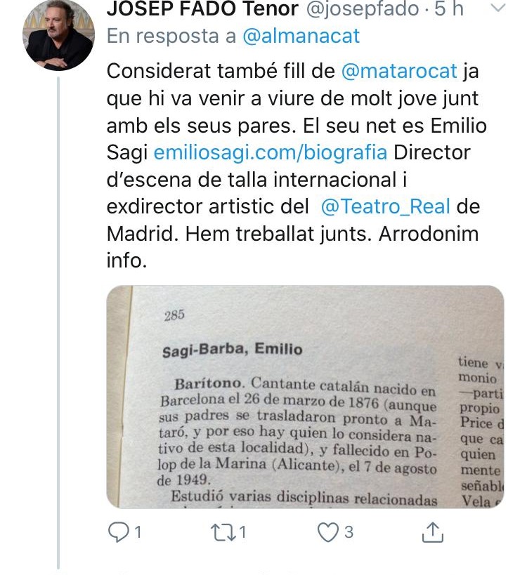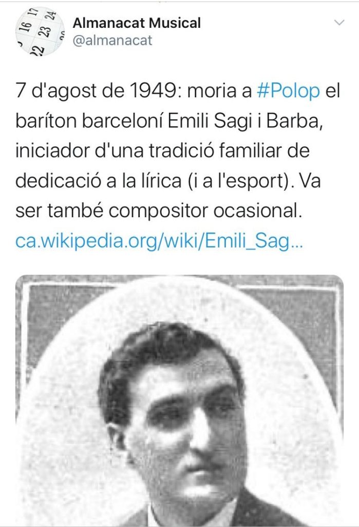 El recuerdo también ha estado presente en las palabras de otros usuarios como el AlmanacatMusical. Una cuenta de twitter que se dedica a conmemorar efemérides y los aniversarios de compositores e intérpretes vinculados al Principado. El pasado 7 de agosto hacía 71 años de la muerte del barítono Emili Sagí en el País Valencià.