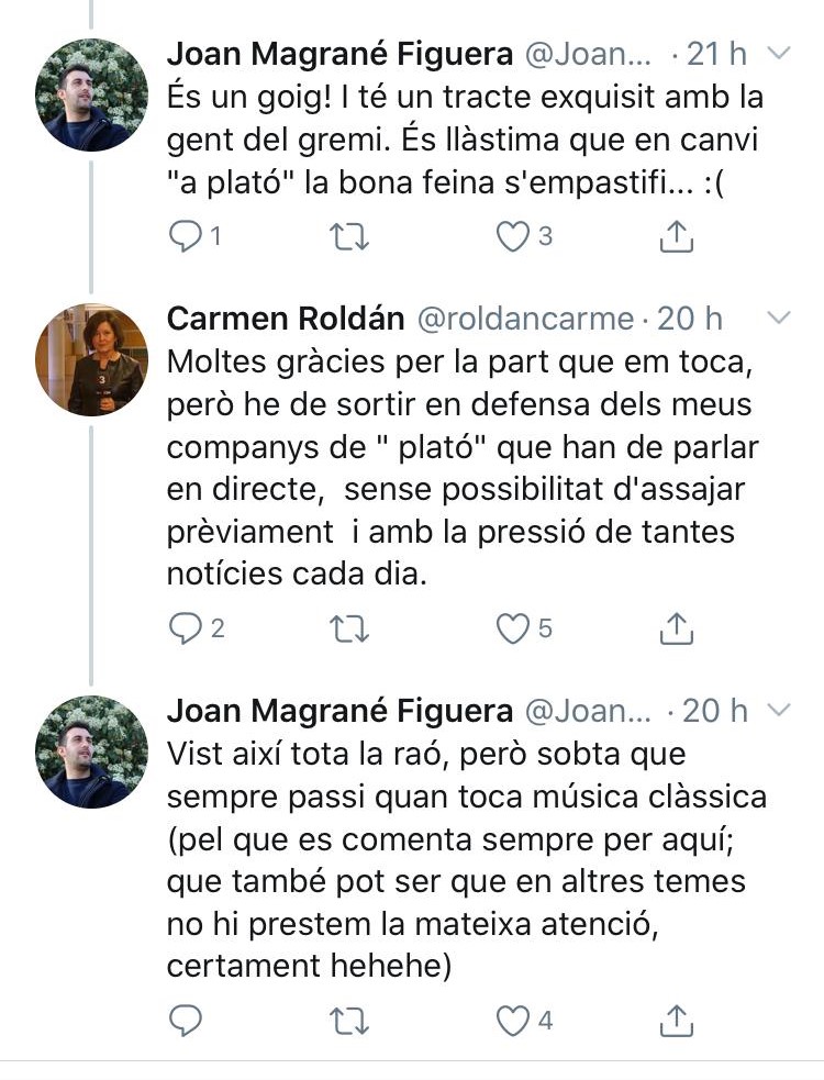Carmen Roldan, periodista de TV3, que firmaba la crónica a la que Raquel Sans daba paso, se añadió al debate en pro de sus compañeros y agradeciendo las palabras de admiración hacia ella.