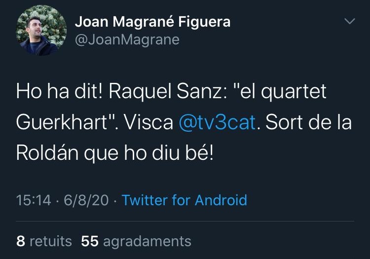 Sea por desconocimiento o por un lapsus, el error de la presentadora del telediario de TV3 Raquel Sans a la hora de pronunciar el nombre del Quartet Gerhard llamó mucho la atención del compositor reusense Joan Magrané que no dudó en compartir su estupor con sus seguidores.