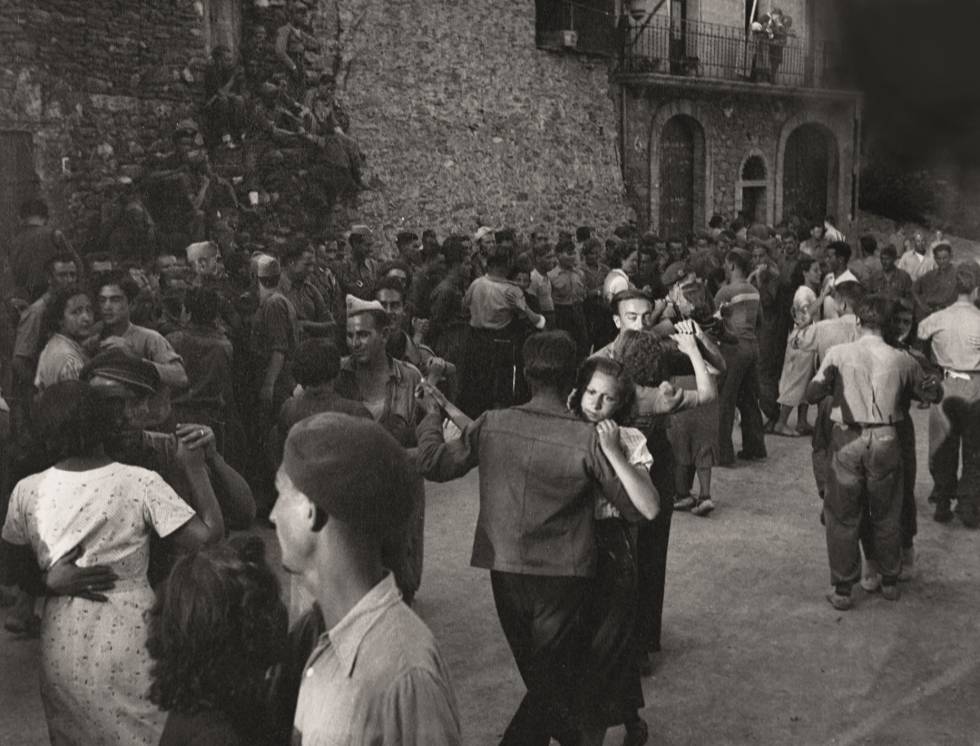 Foto: Benjamin Britten i Sir Lennox Randal Francis Berkeley, fotografiats per Howard Coster l’any 1938. NPG x10472. © National Portrait Gallery, London; Soldats de l'exèrcit Popular de la República ballen amb dones de l'Aliança Nacional de la dona jove a Santa Maria de Meià l'any 1938, Francesc Boix.